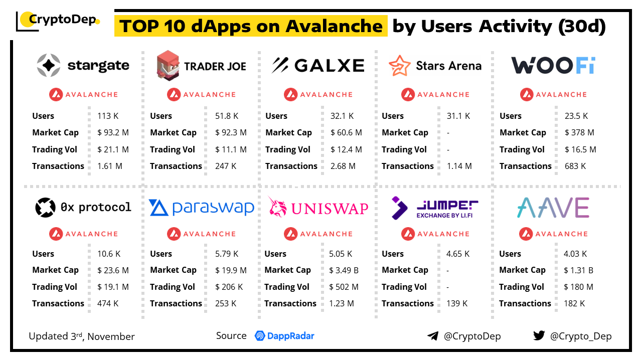 A decentralized application (dApp) is a program built on blockchain that combines a smart contract and a front-end user interface. We present the top dApps on #Avalanche by users activity in the last 30 days, according to the data from DappRadar.