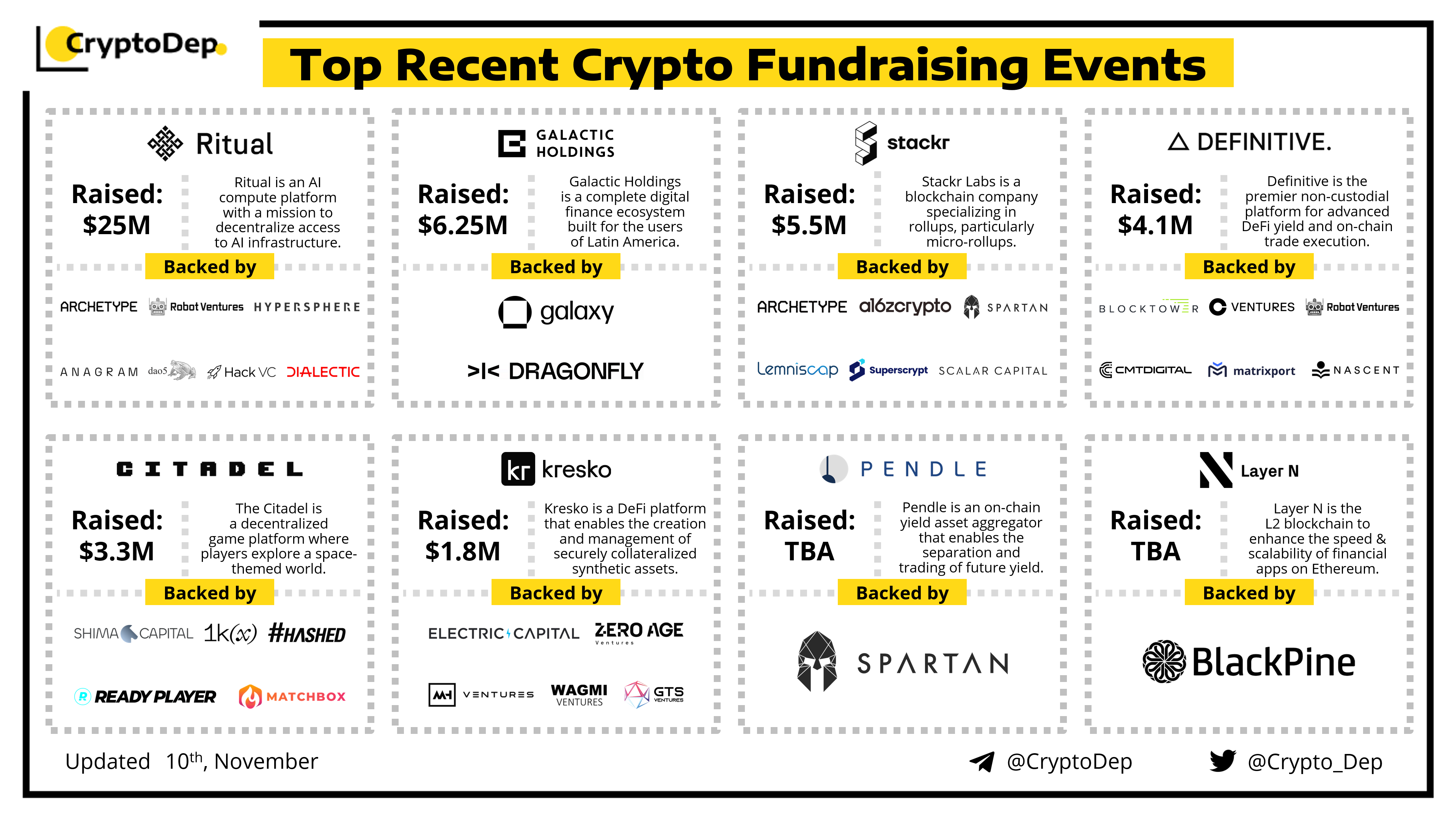 We are excited to present a list of some recent crypto fundraising events, backed by well-known investors such as a16z crypto, Coinbase Ventures, Dragonfly, Electric Capital, Hashed. Galaxy Interactive, Spartan, Robot Ventures, Hack VC, Shima Capital, dao5, and others. Let's take a look!