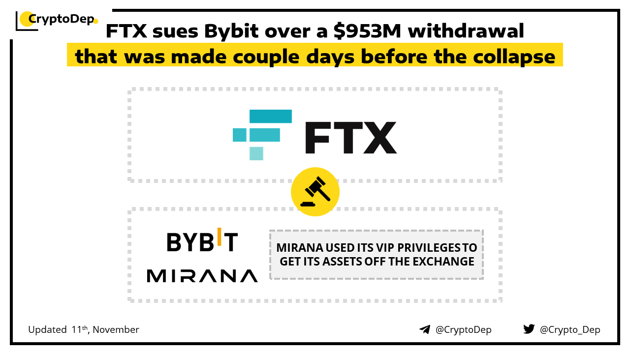 FTXβs bankruptcy advisers have sued Bybit, striving to recover cash and digital assets valued at around $953M that was withdrawn from FTX before it filed Chapter 11 a year ago. Furthermore, the lawsuit alleges Bybitβs investment arm, Mirana Corp., used special βVIPβ benefits to get most of its assets off Bankman-Friedβs platform. According to the complaint, Mirana pressured FTX employees to fulfill its withdraw requests to get money off the exchange as it collapsed.