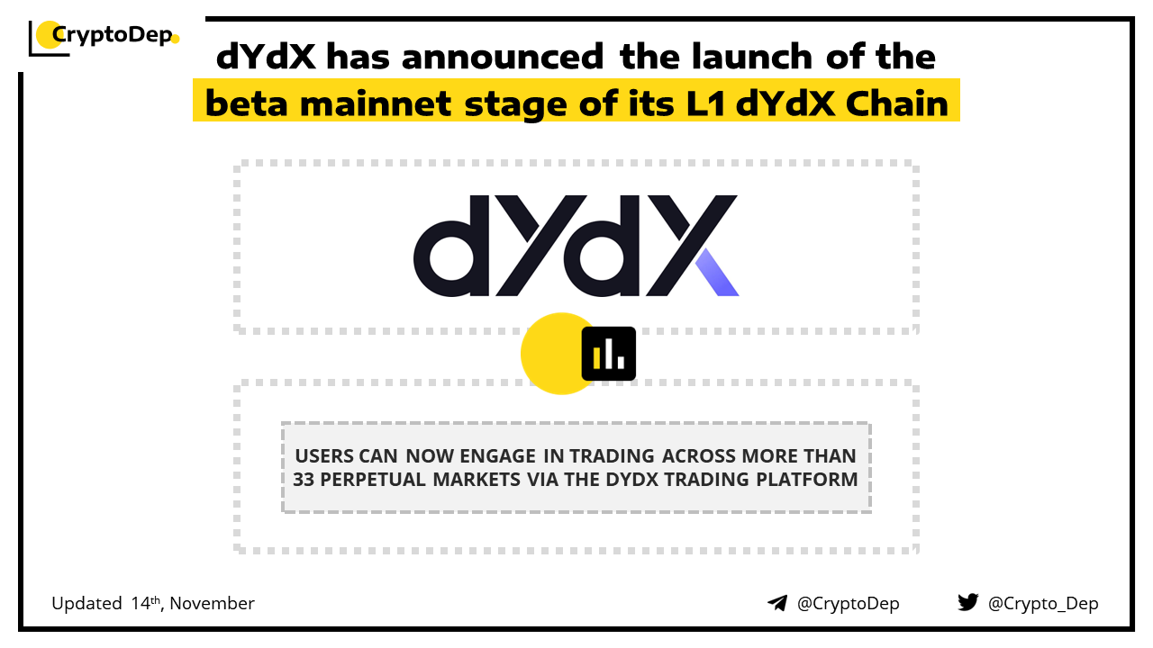 dYdX decentralized exchange launches the beta mainnet stage of its Cosmos-based Layer 1 dYdX Chain. Through this innovation, users can now engage in trading across more than 33 perpetual markets via the dydx trading platform. No trading rewards will be distributed during this stage, but validators and stakers will accrue trading fees, according to the post.