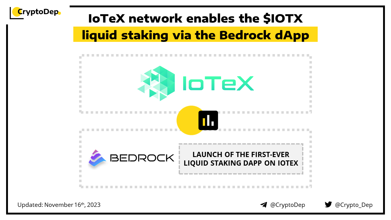 IoTeX has introduced the first-ever IOTX liquid staking dApp: Bedrock. $IOTX holders can stake tokens with Bedrock to receive $uniIOTX, providing users with staking rewards while enabling the flexibility to be traded at any moment. IoTeX is a modular Web3 infrastructure platform connecting smart devices and real-world data to blockchains.