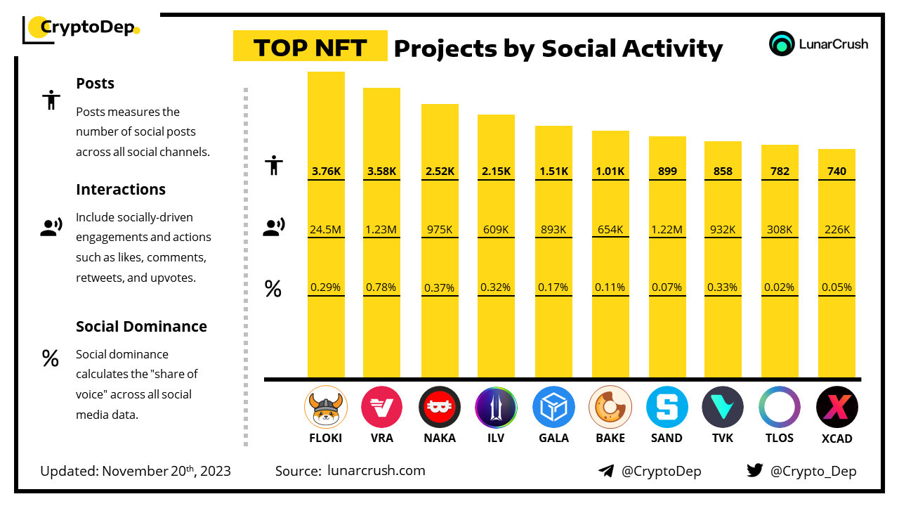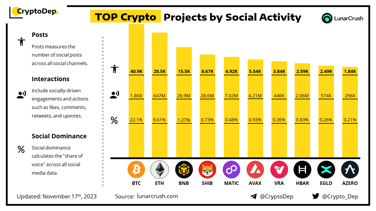 Interactions include socially-driven engagements and actions such as likes, comments, retweets, and upvotes.
