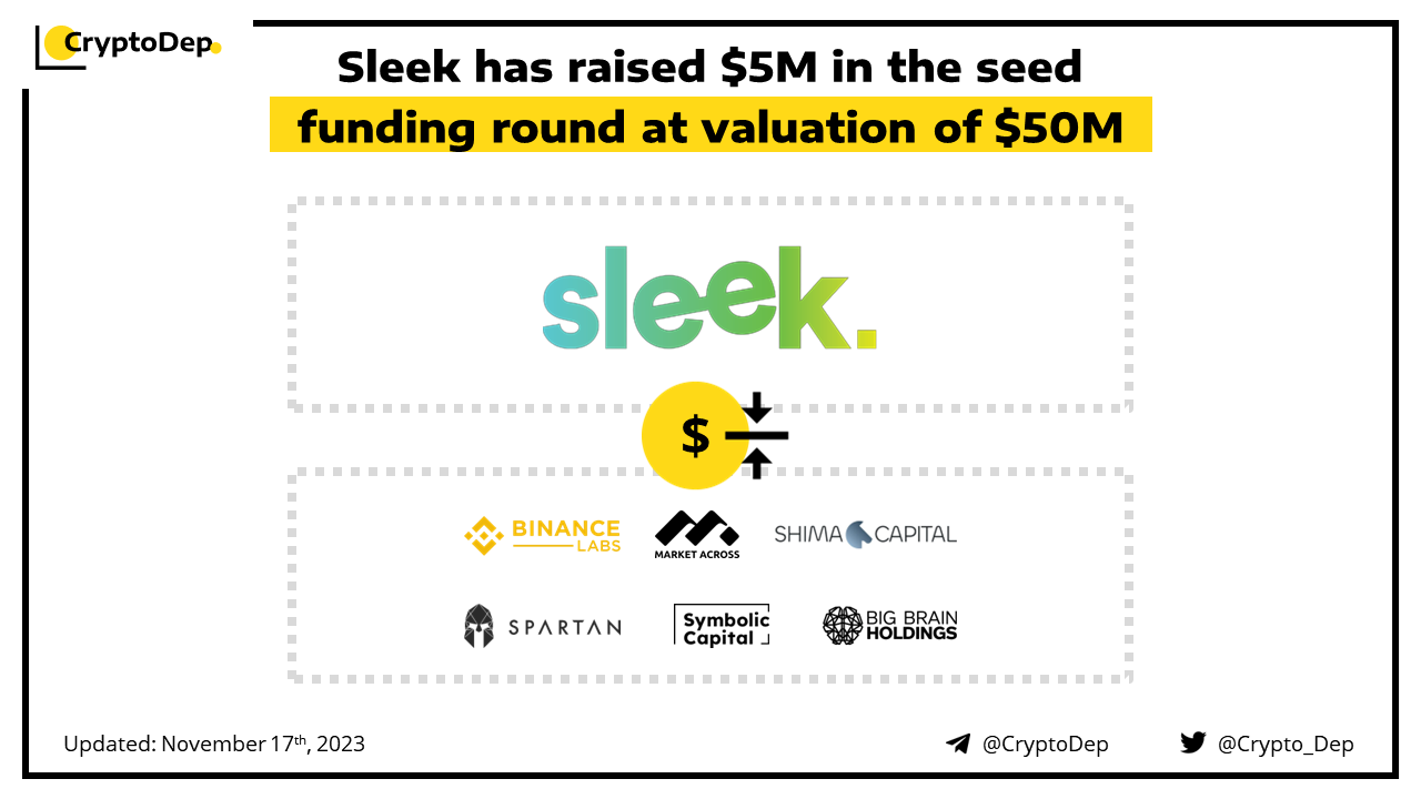 Sleek, a web3 social network platform, raises $5M in the seed investment round, reaching the valutation of $50M. Among investors are Binance Labs, Shima Capital, Spartan Group, Symbolic Capital, Market Across and Big Brain Holdings. The fundraise was realized via a SAFT and will be used to develop a web3 social network.