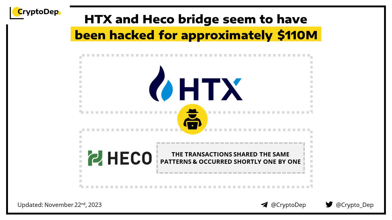 Heco bridge and the HTX exchange appear to be drained for ~$110M. An array of on-chain analytics claim that the Heco bridge and HTX exchange lost $86.6M and $23.4M respectively. The suspicious transactions shared the same patterns for both exploits and occurred shortly one by one. HTX claimed that all losses would be fully compensated, while also halting the deposits and withdrawals on its platform.