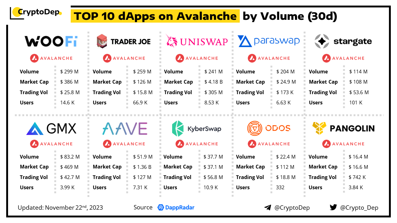 A decentralized application (dApp) is a program built on blockchain that combines a smart contract and a front-end user interface. We present the top dApps on #Avalanche by volume in the last 30 days, according to the data from DappRadar.