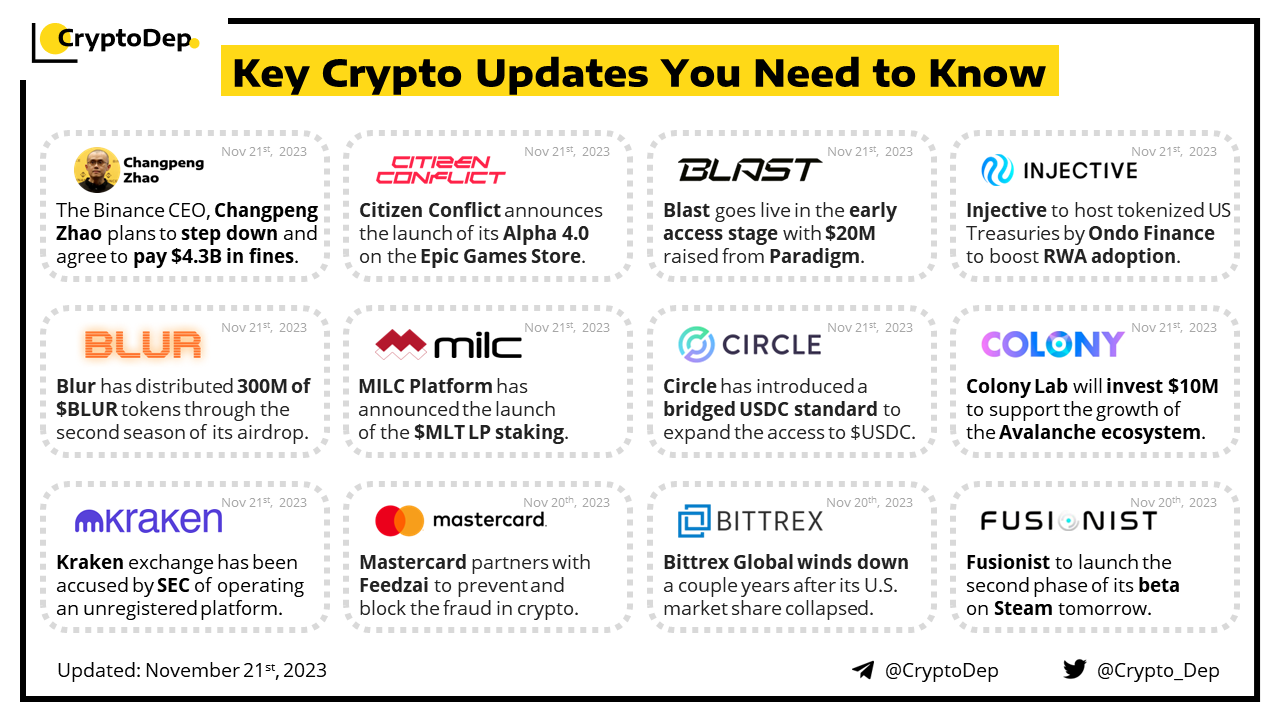According to WSJ, Changpeng Zhao, the chief executive of Binance, has announced his plans to step down and pay $4.3B in fines. CZ has also reportedly pleaded guilty to violating criminal U.S. anti-money laundering requirements, in a deal that may preserve the companyβs ability to continue operating. However, CZ will still retain majority ownership of Binance. Yesterday, the U.S. Department of Justice demanded $4B from the Binance crypto exchange to end an ongoing criminal investigation.