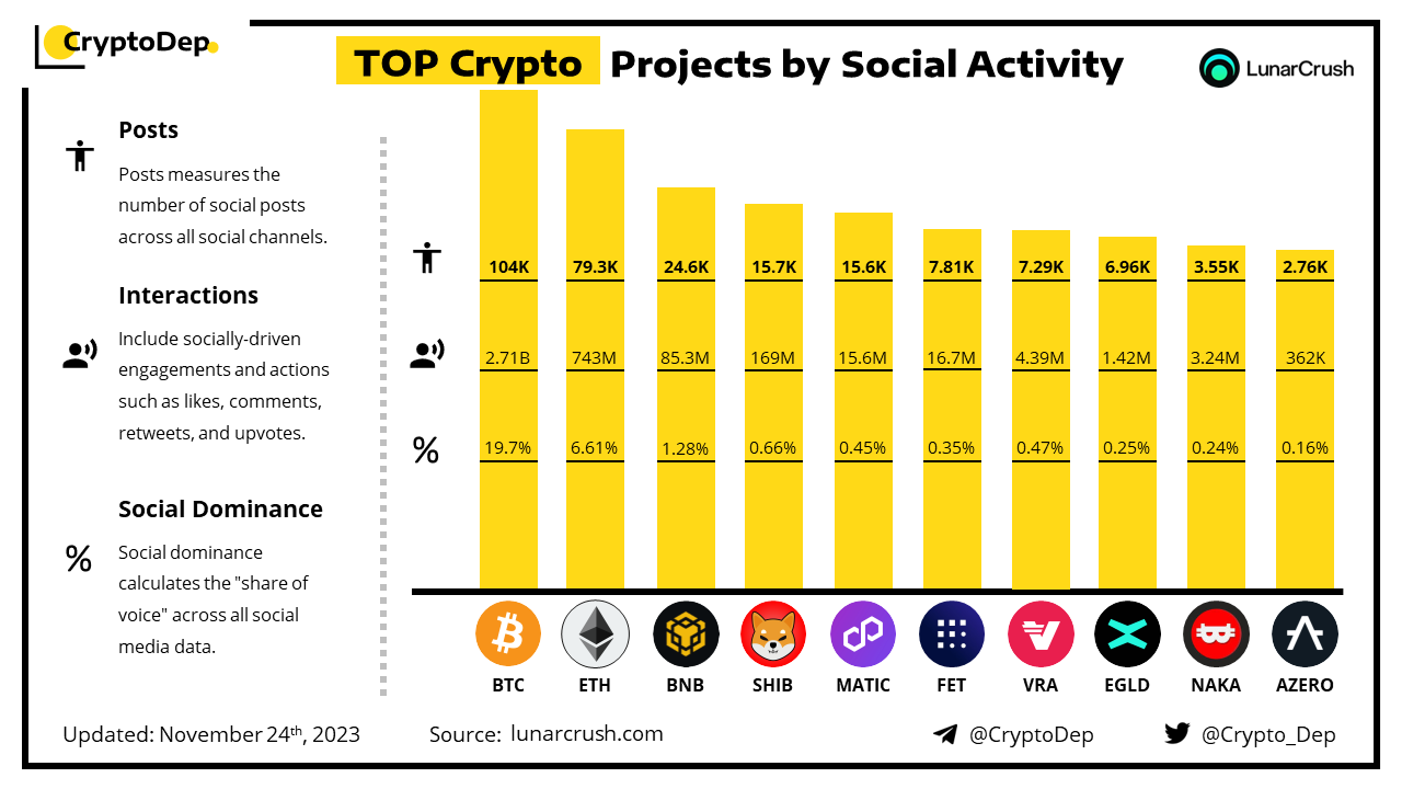 Interactions include socially-driven engagements and actions such as likes, comments, retweets, and upvotes.