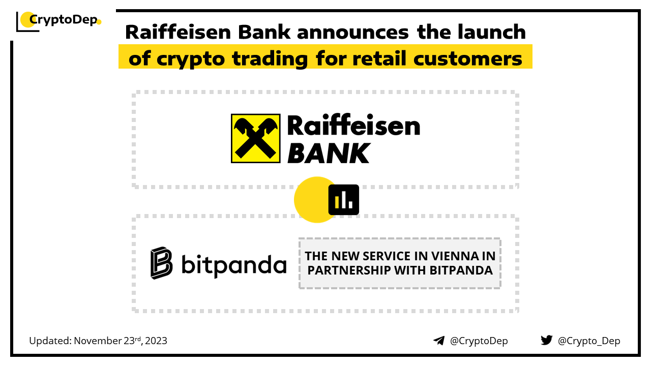Austriaβs Raiffeisen Bank will roll out cryptocurrency trading services for retail customers by the end of January 2024. The innovation will initially be offered to customers in Vienna and facilitated through the partnership with the Bitpanda exchange.