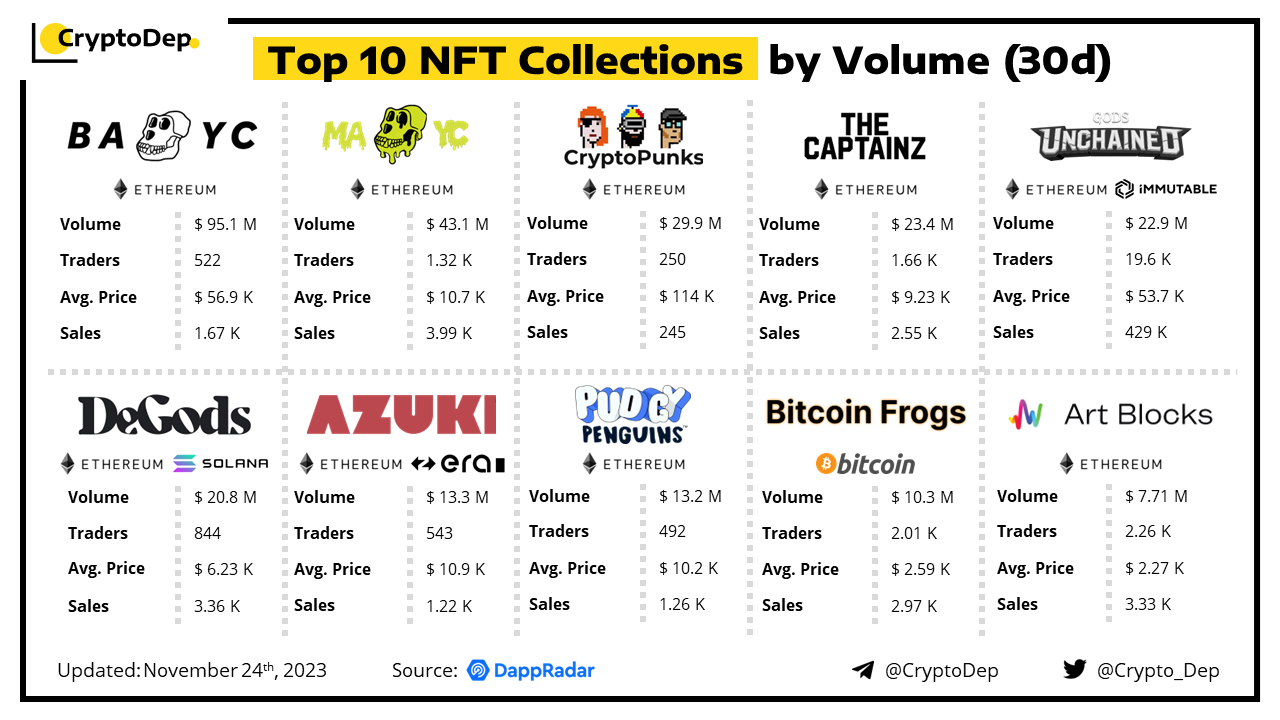 Let's analyze top #NFT collections by volume in the last 30 days, according to the data from DappRadar. Bored Ape Yacht Club, Mutant Ape Yacht Club, CryptoPunks, The Captainz, and Gods Unchained are among the leaders.