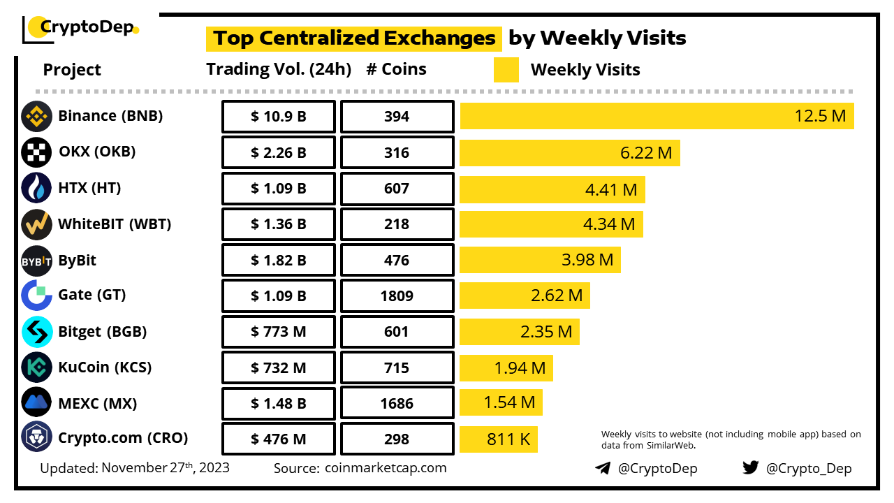 Let's take a look at the ranking of top centralized exchanges by weekly visits. Weekly visits to the website (not including mobile app) based on data from SimilarWeb and CoinmarketCap.