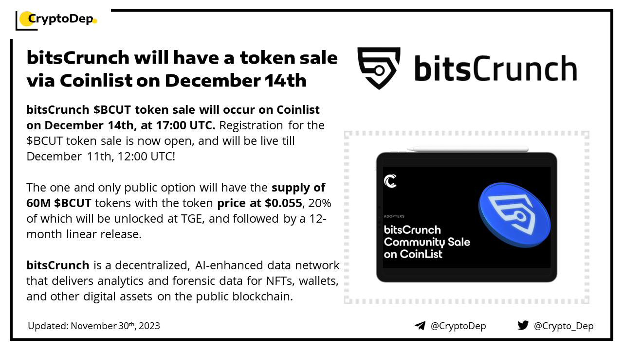 bitsCrunch $BCUT token sale will occur on Coinlist, on December 14th, at 17:00 UTC. Registration for the $BCUT token sale is now open, and will be live till December 11th, 12:00 UTC! bitsCrunch is a decentralized, AI-enhanced data network that delivers analytics and forensic data for NFTs, wallets, and other digital assets on the public blockchain.
