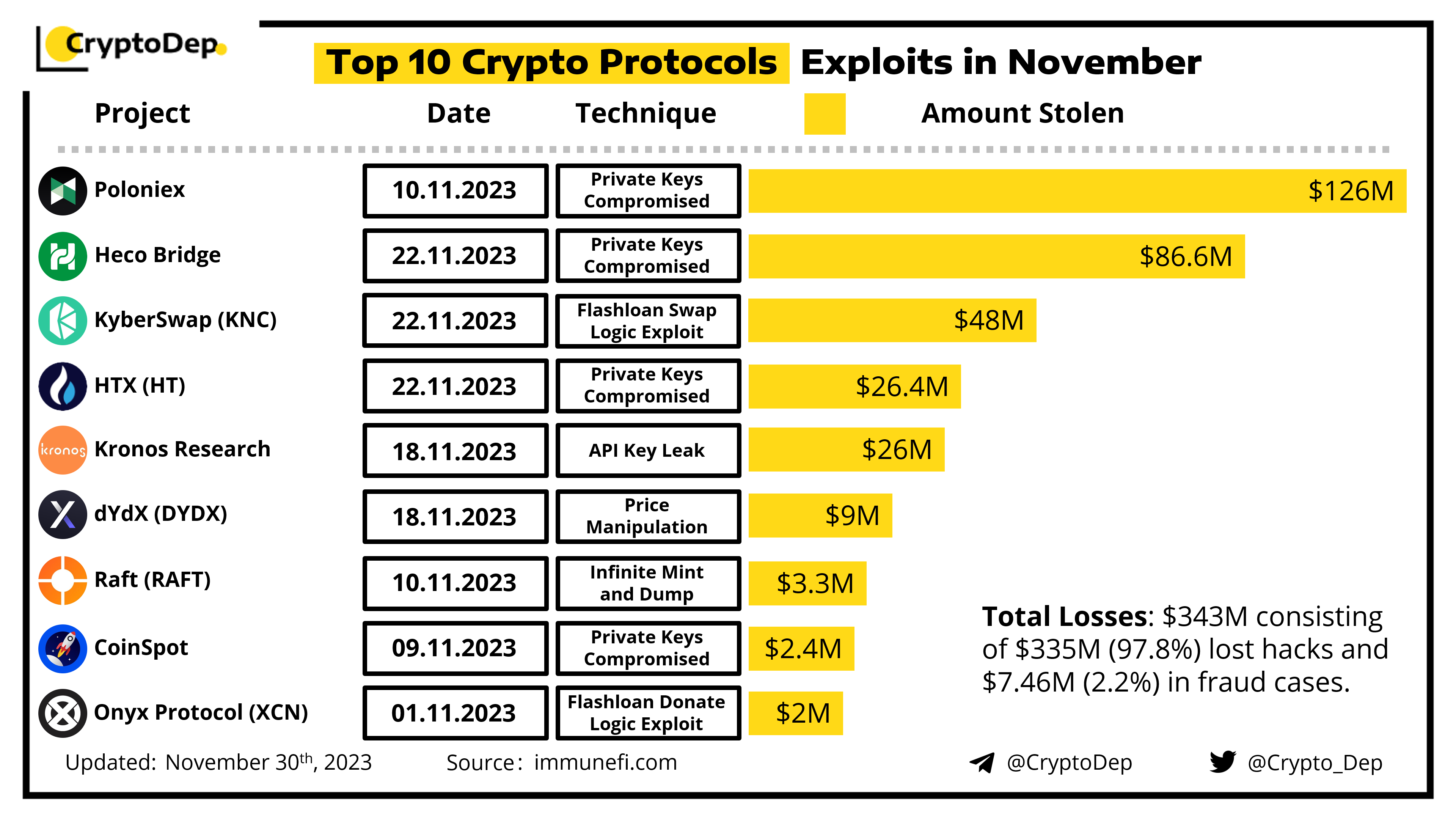 During November 2023, the crypto industry saw a loss of $343M across the web3 ecosystem. According to Immunefi's report, $335.5M was lost to hacks across 18 specific incidents, and $7.46M was lost to fraud across 23 specific incidents. Let's analyze the largest losses of the month!