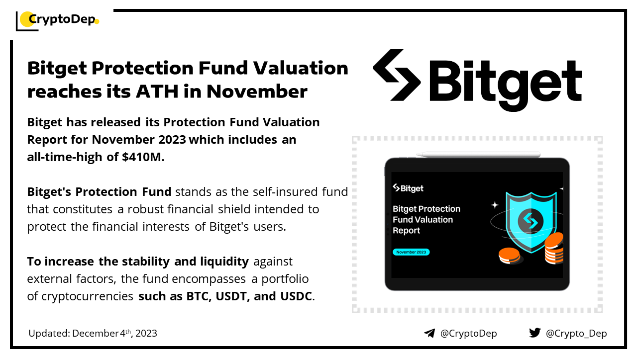 Bitget has released its Protection Fund Valuation Report for November 2023 which includes an all-time-high of $410M. Bitget's Protection Fund stands as the self-insured fund that constitutes a robust financial shield intended to protect the financial interests of Bitget's users. To increase the stability and liquidity against external factors, the fund encompasses a portfolio of cryptocurrencies such as BTC, USDT, and USDC.