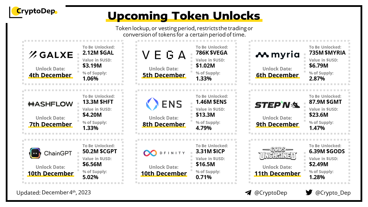 Let's take a look at the compilation of major upcoming token unlocks, diving into details such as dates, amounts, and projects related to tokens that are currently locked up, but will soon be released to the market. During this week, $GMT, $ICP, $ENS, $MYRIA, and $CGPT will have the biggest unlocks.