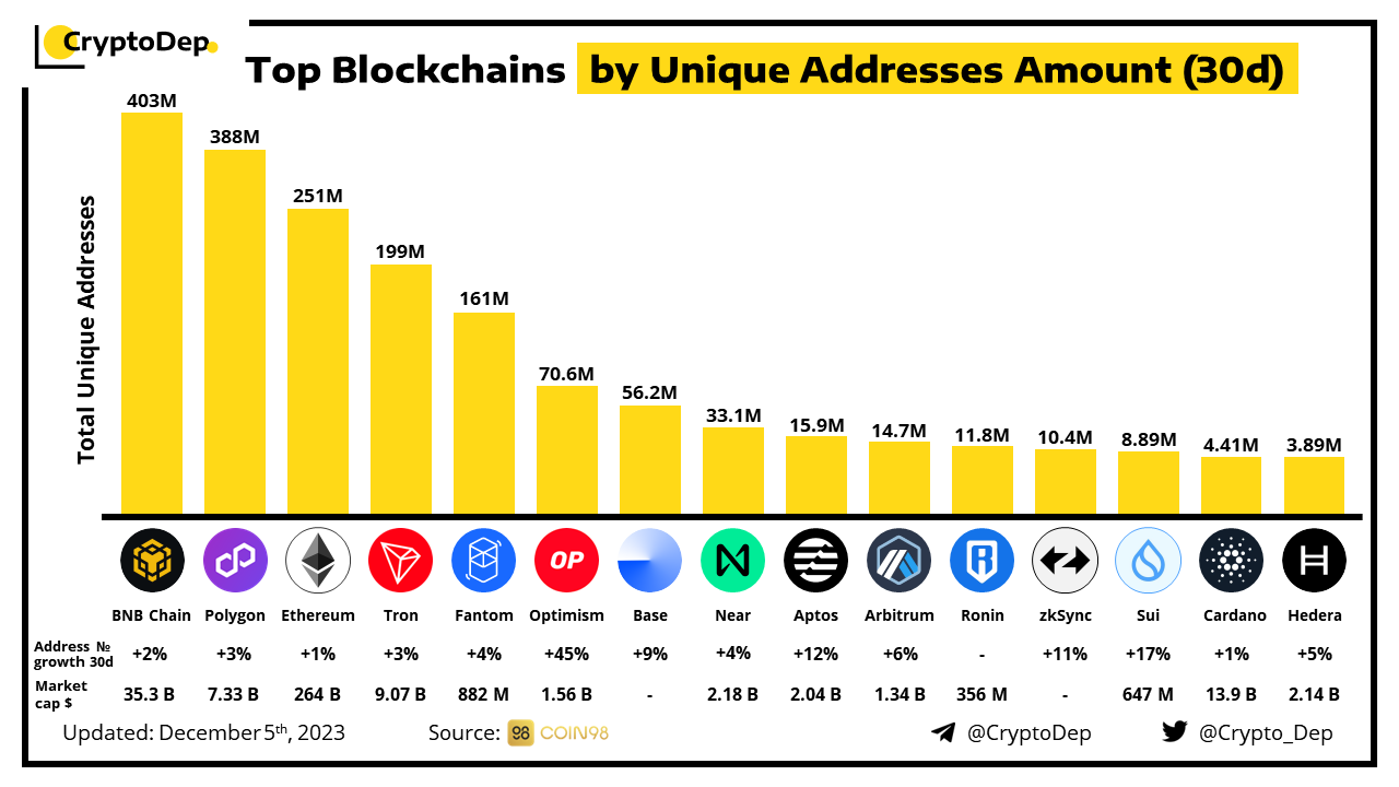 ββTop Blockchains by Unique Addresses Amount in Last 30 Days