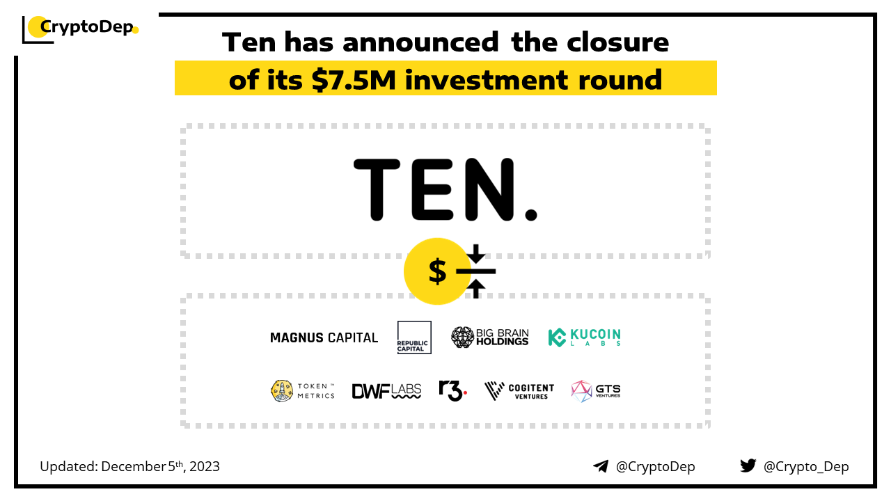 Ten (formerly Obscuro) has raised $7.5M in funding to complete the mission of bringing Encryption to Ethereum. Round participants included Republic Capital, KuCoin Labs, Big Brain Holdings, Magnus Fund, Builder Capital, DWF Labs, Token Metrics, Cogitent Ventures, GTS Ventures, and others. Ten is a Layer 2 rollup that hyper-scales and encrypts Ethereum.