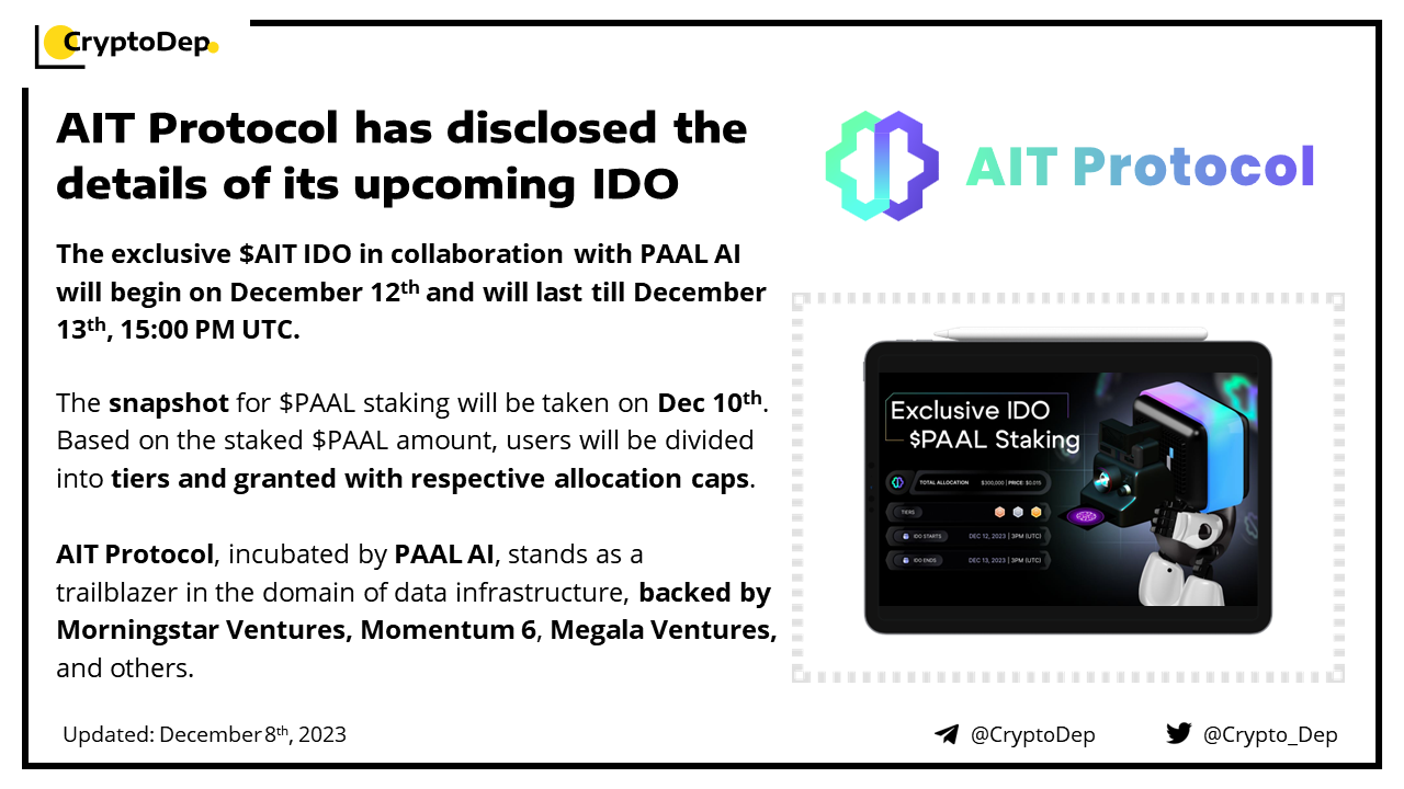 The exclusive $AIT IDO in collaboration with PAAL AI will begin on December 12th and will last till December 13th, 15:00 PM UTC. The snapshot for $PAAL staking will be taken on Dec 10th. Based on the staked $PAAL amount, users will be divided into tiers (gold, silver, and bronze) and granted with respective allocation caps. AIT Protocol, incubated by PAAL AI, stands as a trailblazer in the domain of data infrastructure, backed by Morningstar Ventures, Momentum 6, and others.