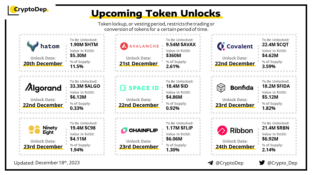 Let's take a look at the compilation of major upcoming token unlocks, diving into details such as dates, amounts, and projects related to tokens that are currently locked up, but will soon be released to the market. During this week, $AVAX, $RBN, $ALGO, $FLIP, and $HTM will have the biggest unlocks.