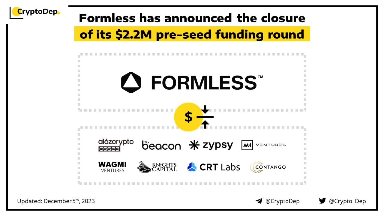 Formless, a decentralized network and digital space, has raised $2.2M in the pre-seed investment round. Among investors are a16zcrypto CSS, Beacon Accelerator, Zypsy, WAGMIventures, MH Ventures, VVV, Knights Capital, Contango Digital Assets, and others. The funds will be used to advance the SHARE Protocol, powering the next generation of products and experiences in a multiplayer digital economy.