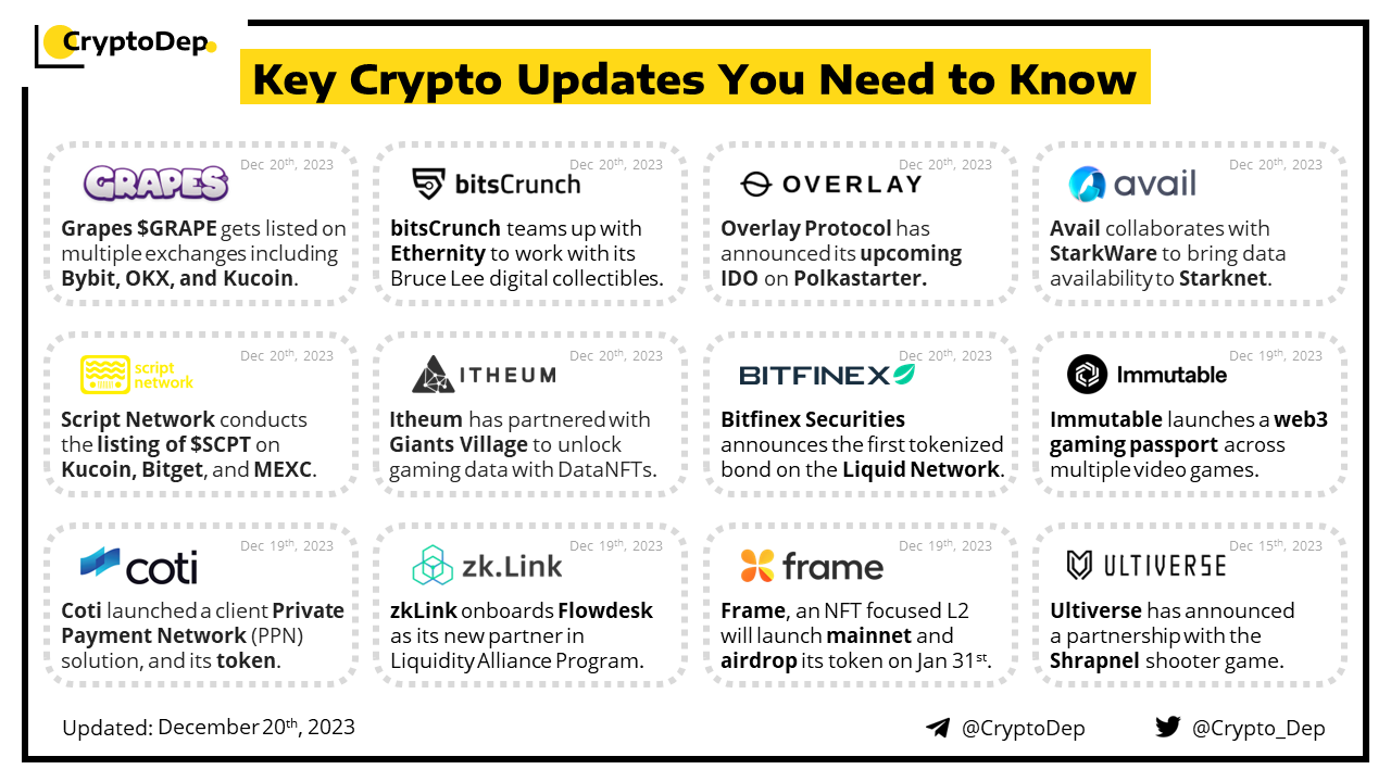 Grapes $GRAPE token will be listed on the Bybit exchange tomorrow, on December 21st, at 11:00 AM UTC. Users can grab a share of the 4.5M $GRAPE and 80K $USDT prize pool. Moreover, Grapes has successfully conducted its public sale on the LaunchBlock platform. Grapes, backed by Animoca Brands, is a collection of 3,333 crafted NFTs, which has developed into a cross-media project with games, animated series, merchandising, and licensing.