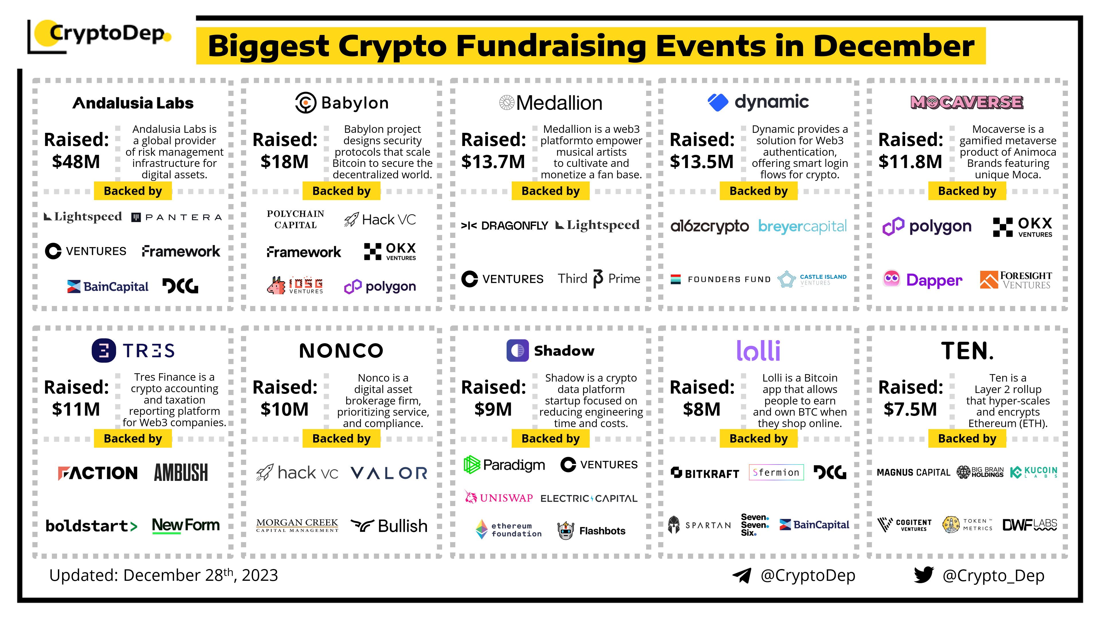 Presenting a list of the biggest crypto fundraising events in December 2023, backed by well-known investors such as Paradigm, a16z crypto, Pantera Capital, Dragonfly, Polychain Capital, Dapper Labs, Coinbase Ventures, Electric Capital, Bain Capital, Uniswap, Polygon Ventures, and others. Let's take a look!
