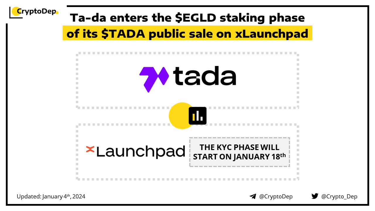 The $EGLD staking phase for the $TADA sale on xLaunchpad, the official launchpad of MultiversX, is now live and will last till January 19th. To participate in the sale, users can stake their $EGLD through Hatom Protocol, Demiourgos Holdings, and Salsa. Moreover, the launchpad will open the KYC phase on January 18th and will conduct the verification exclusively through xPortal.