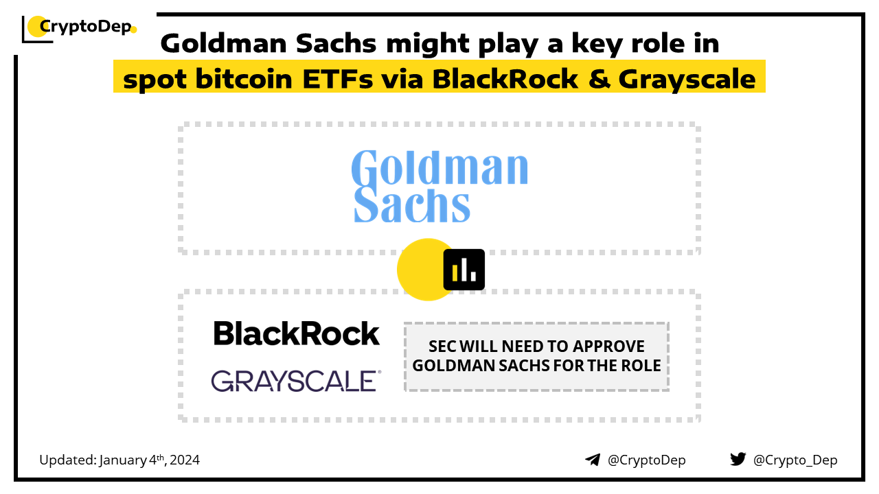 Goldman Sachs is reportedly in talks with BlackRock and Grayscale about playing a key role in their proposed spot bitcoin ETFs. After the needed approval from the SEC, Goldman Sachs will serve as an "authorized participant" to BlackRock and Grayscale Investments' spot bitcoin ETFs. According to the sources related to the cause, the regulator will offer a decision on spot ETFs, sometime between January 8 and January 10.