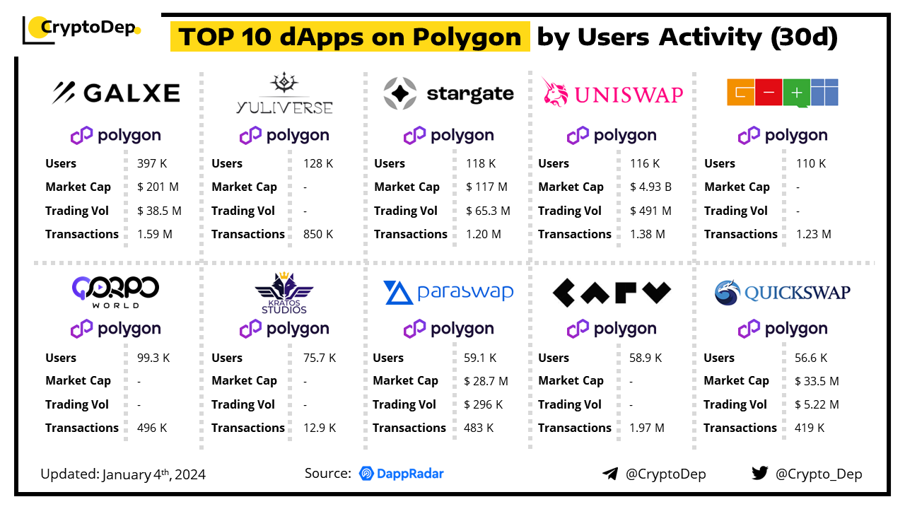 A decentralized application (dApp) is a program built on blockchain that combines a smart contract and a front-end user interface. We present the top dApps on #Polygon by users activity in the last 30 days, according to the data from DappRadar.