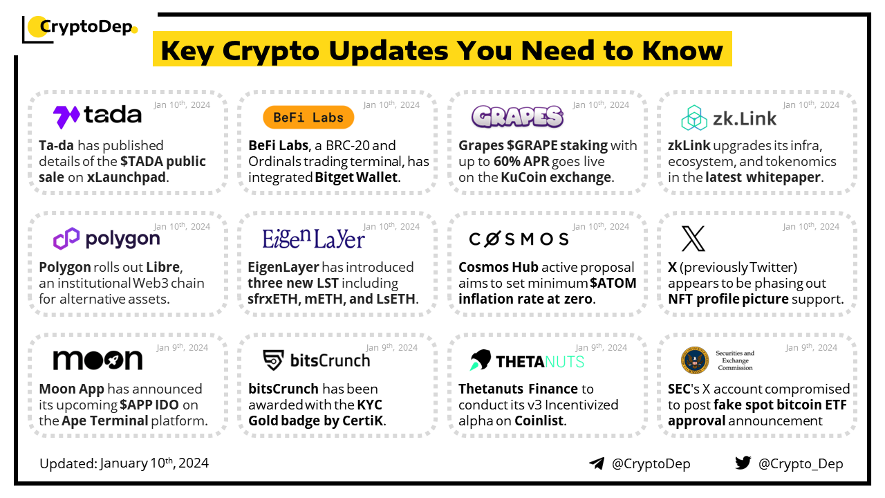 The Securities and Exchange Commission (SEC) has just approved proposals for 11 spot bitcoin ETFs on an accelerated basis. In its document, SEC lists 11 spot bitcoin ETFs by Bitwise, Grayscale, Hashdex, BlackRock, Valkyrie, BZX, Invesco, VanEck, WisdomTree, Fidelity, and Franklin. Trading is likely to start tomorrow on registered U.S. securities exchanges.