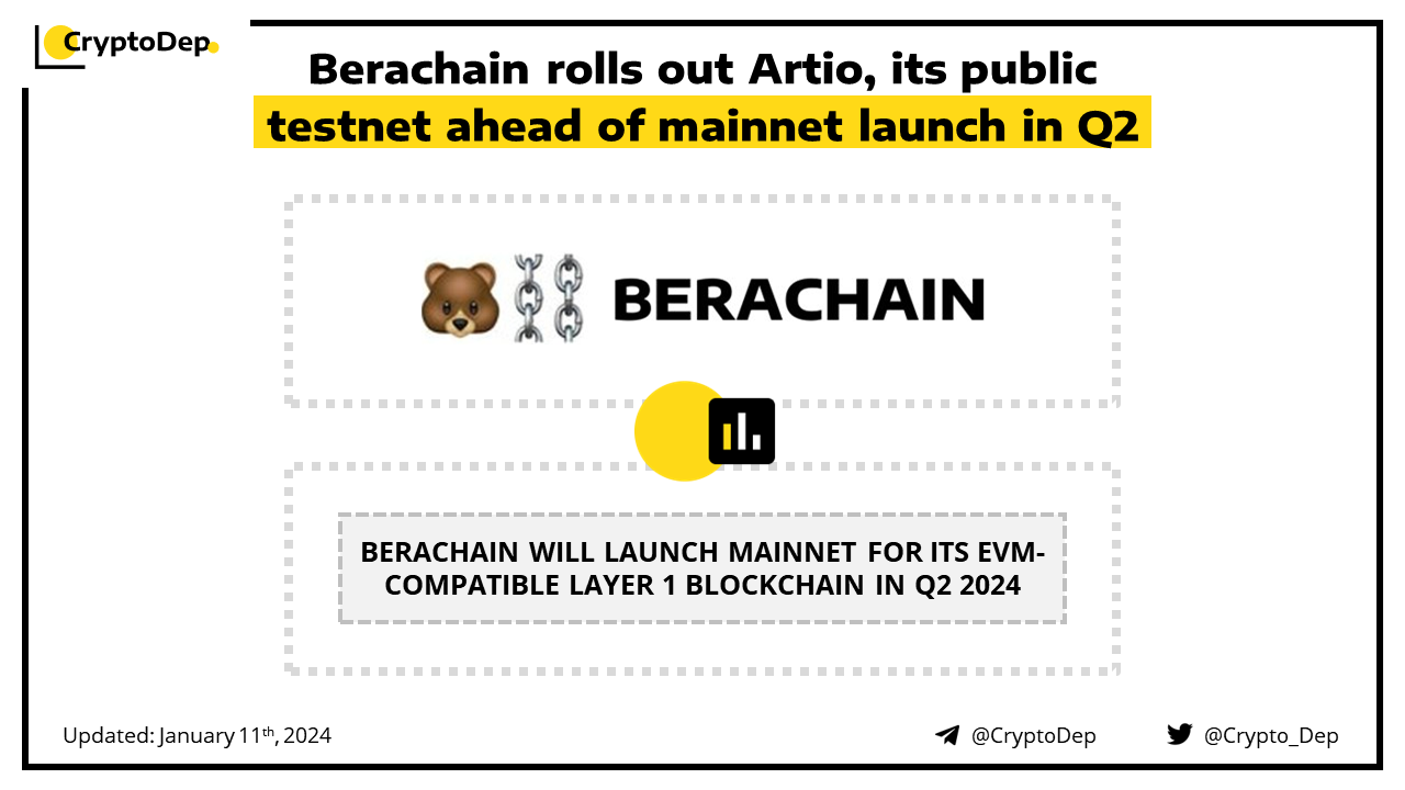 Berachain, an Ethereum Virtual Machine-compatible Layer 1 blockchain built on the Cosmos SDK, has introduced Artio, its public test network. The project will then launch its mainnet in Q2 2024, with 100+ teams from other networks planning on deploying on testnet and mainnet. Back in 2023, Berachain raised $42M in a round led by Polychain Capital at a $420M valuation.