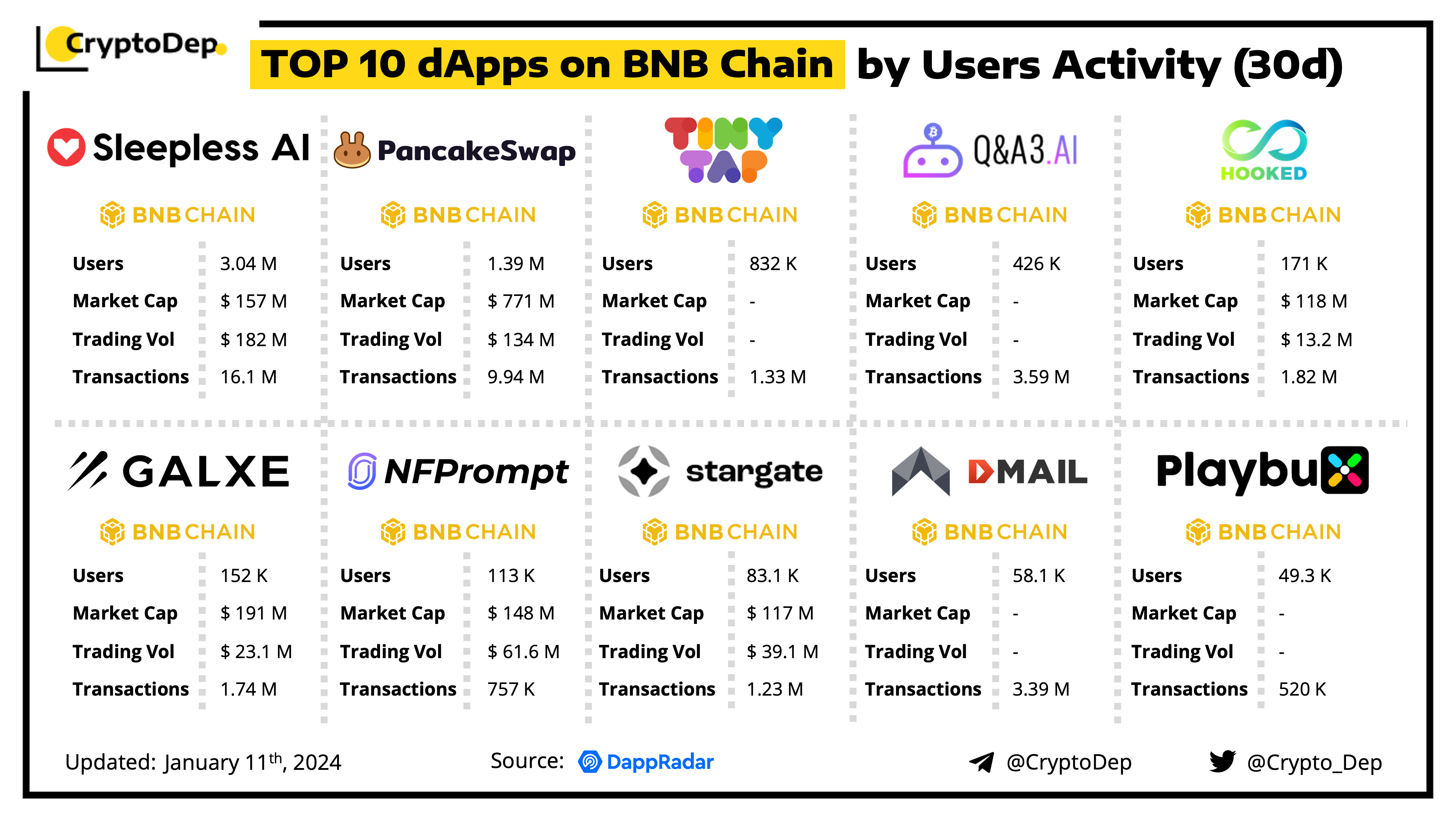 A decentralized application (dApp) is a program built on blockchain that combines a smart contract and a front-end user interface. We present the top dApps on #BNBChain by volume in the last 30 days, according to the data from DappRadar.