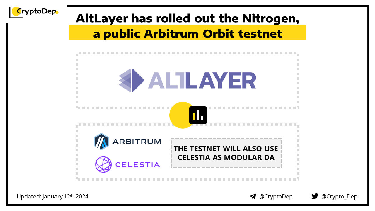 AltLayer, an Ethereum scaling startup, has introduced Nitrogen, its public Arbitrum Orbit testnet using Celestia as modular data availability layer. Moreover, Nitrogen is secured by working Arbitrum Nitro fraud proofs and integrates with Celestia Blobstream on Arbitrum Sepolia. Earlier in 2022, AltLayer raised $7.2M in a seed funding round and received an investment from Binance Labs in 2023.