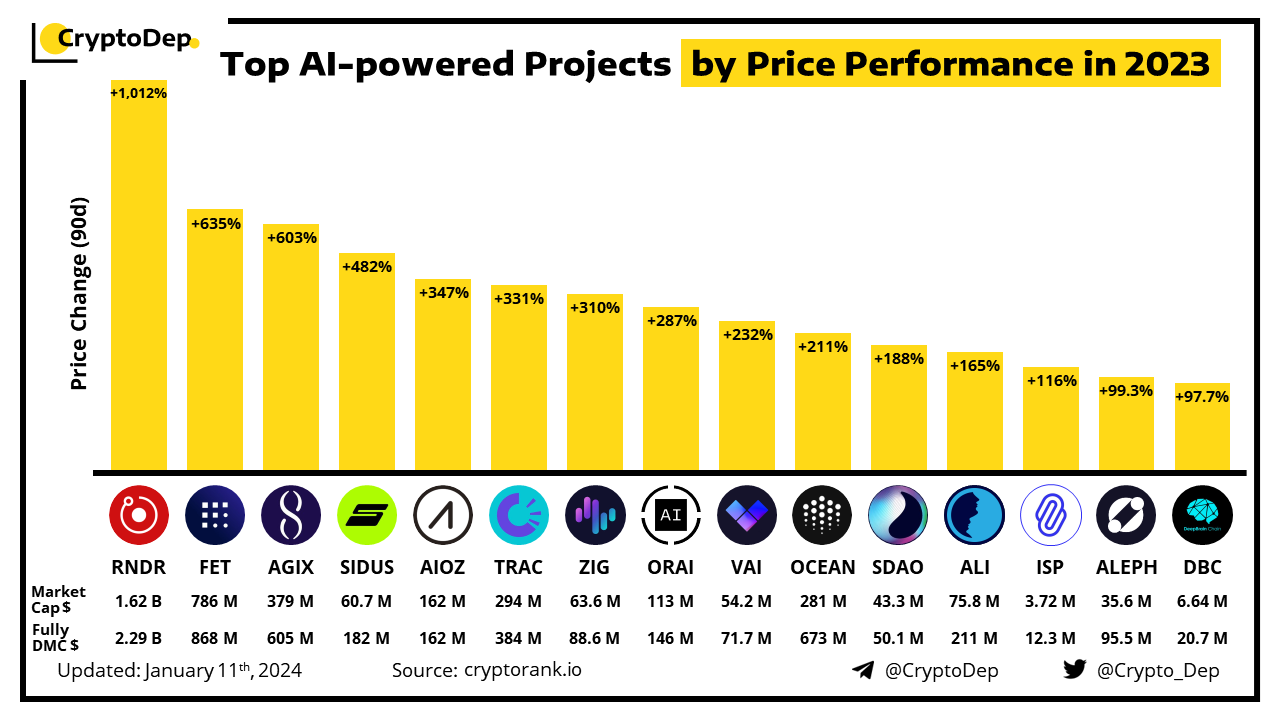 Over this year, the AI narrative has gained a lot of momentum in the crypto industry. AI technologies have become popular among blockchain projects and audiences, bringing innovations. Let's take a look at the best-performing AI-powered projects in 2023.