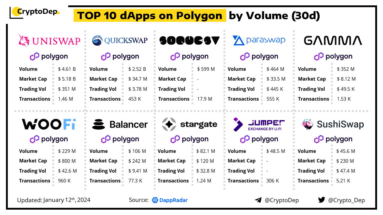 A decentralized application (dApp) is a program built on blockchain that combines a smart contract and a front-end user interface. We present the top dApps on #Polygon by volume in the last 30 days, according to the data from DappRadar.