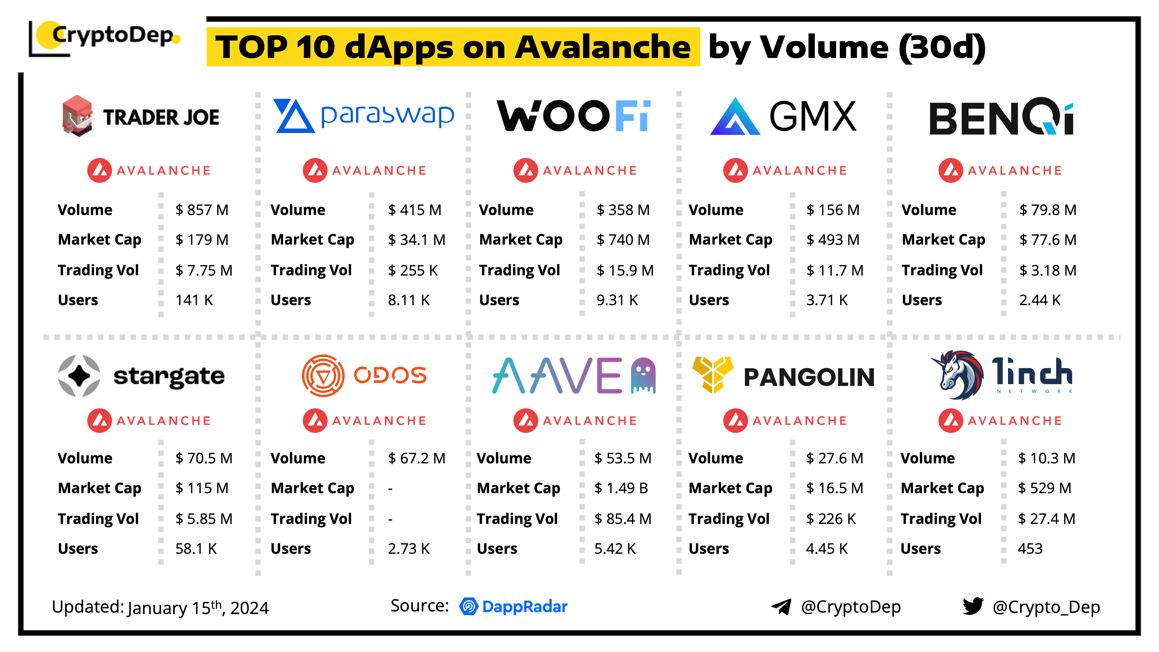 A decentralized application (dApp) is a program built on blockchain that combines a smart contract and a front-end user interface. We present the top dApps on #Avalanche by volume in the last 30 days, according to the data from DappRadar.