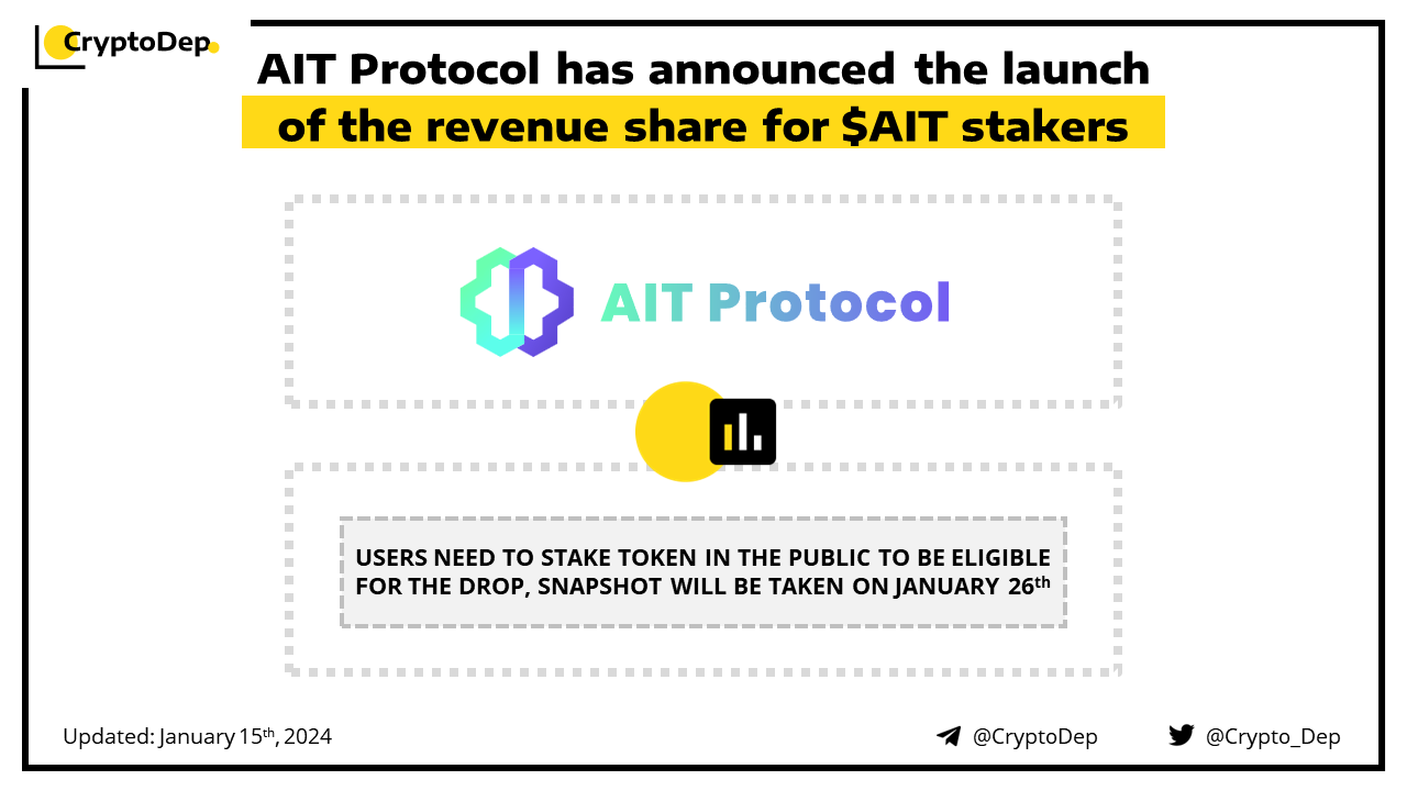 AIT Protocol rolls out revenue share for $AIT stakers, with the snapshot to be taken on January 26th. Users need to stake tokens in the public pool to be eligible for the drop. The protocol opened its public staking pools earlier in January. AIT Protocol is the inaugural data infrastructure dedicated to data annotations and the training of AI models, incubated by PAAL AI and Metabros.