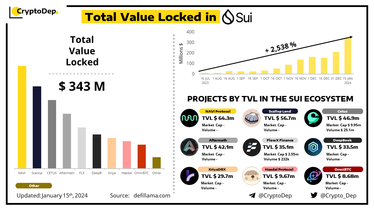 Let's take a look at the general TVL overview of the whole #Sui ecosystem, diving into the rankings of top chain's protocols by TVL, their market share, and current market stats. According to the data from DefiLama, NAVI Protocol leads by TVL, followed by Scallop Lend, Cetus Protocol, Aftermath Protocol, FlowX Finance, and others.