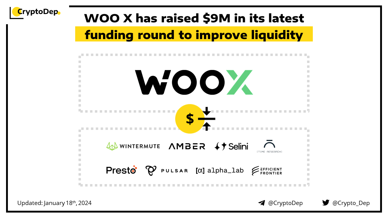 WOO X, a crypto exchange powered by $WOO token, secured $9M in a funding round from Wintermute, Amber, Selini Capital, Time Research, Presto Labs, Pulsar, AlphaLab Capital, Efficient Frontier, and Riverside Hedge. The funds will be primarily used for global market expansion, enhancing its product suite, and obtaining regulatory licenses in key markets.