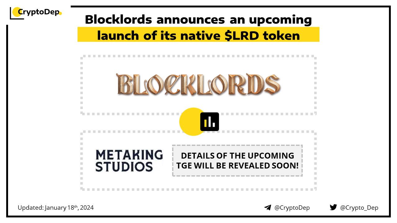 Blocklords has announced an upcoming TGE of its native $LRD token, with more details to be revealed soon. Blocklords is a player-driven MMO medieval grand strategy game with GameFi activities, developed by MetaKing Studios. To date, Blocklords has achieved more than 40K downloads on the Epic Games Store, with 1M weekly hours played and 2.2k battle passes claimed by users.