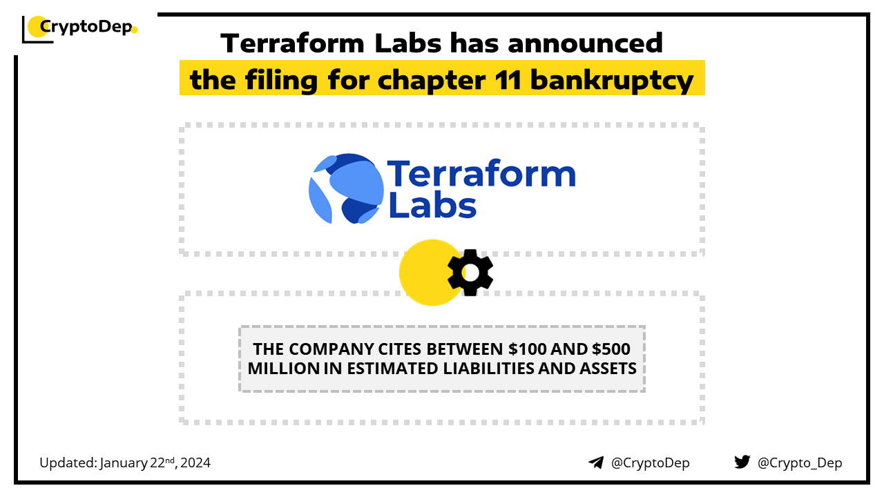 Terraform Labs, the company behind the now-defunct TerraUSD $UST stablecoin, has filed for Chapter 11 bankruptcy protection at the United States Bankruptcy Court for the District of Delaware, citing between $100 and $500 million in estimated liabilities and assets. The bankruptcy filing comes just four days after the SEC agreed to postpone Kwonβs upcoming fraud trial to March 25th. Do Kwon, the co-founder of Terraform Labs was arrested in Montenegro in March 2023 after attempting to use falsified travel documents to leave the country.