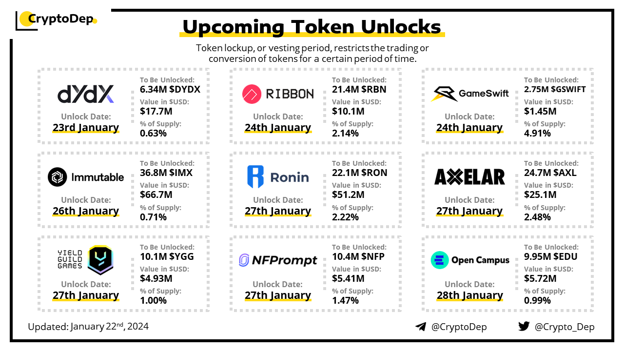 Let's take a look at the compilation of major upcoming token unlocks, diving into details such as dates, amounts, and projects related to tokens that are currently locked up, but will soon be released to the market. During this week, $IMX, $RON, $AXL, $DYDX, and $RBN will have the biggest unlocks.