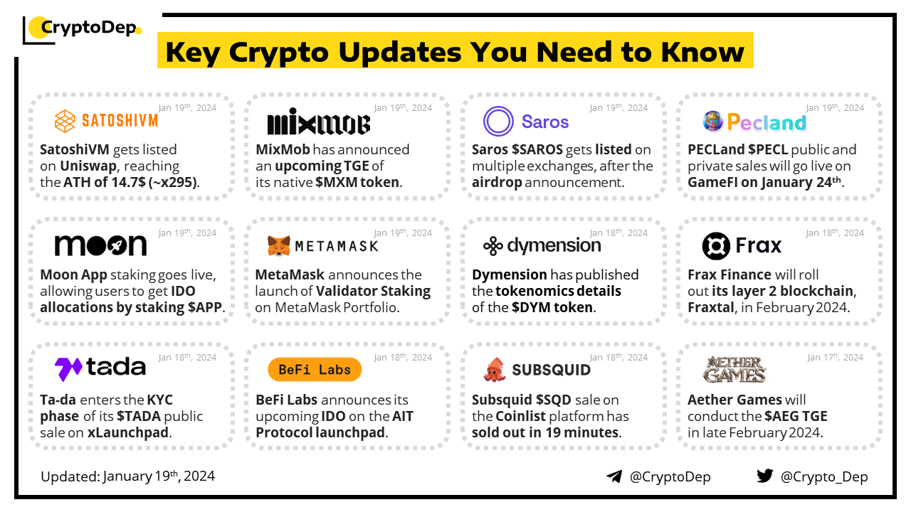 Trading for the $SAROS token will go live on KuCoin, Bitget, HTX, Bybit, MEXC, BTSE, and Gate today, on January 19th, at 11:00 AM UTC. Moreover, Saros has announced a snapshot and token airdrop of 5% of the total SAROS supply that will be airdropped on January 19th. Saros is a Solana-based unified Suite of DeFi products with three fundamental building blocks: SarosSwap (AMM), SarosFarm, and SarosStake, in which SarosSwap is the core of the entire ecosystem.