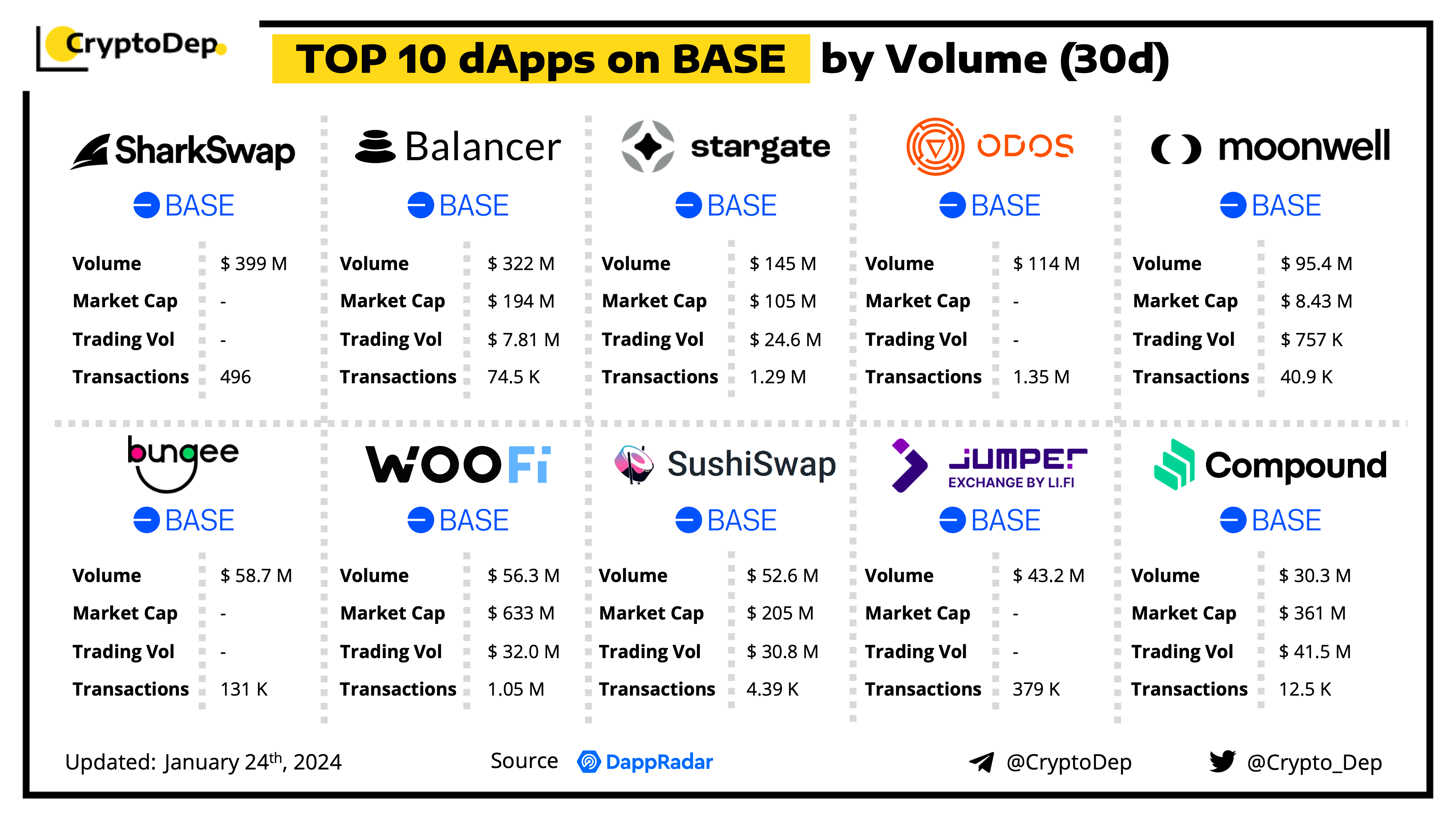 A decentralized application (dApp) is a program built on blockchain that combines a smart contract and a front-end user interface. We present the top dApps on #Base by volume in the last 30 days, according to the data from DappRadar.