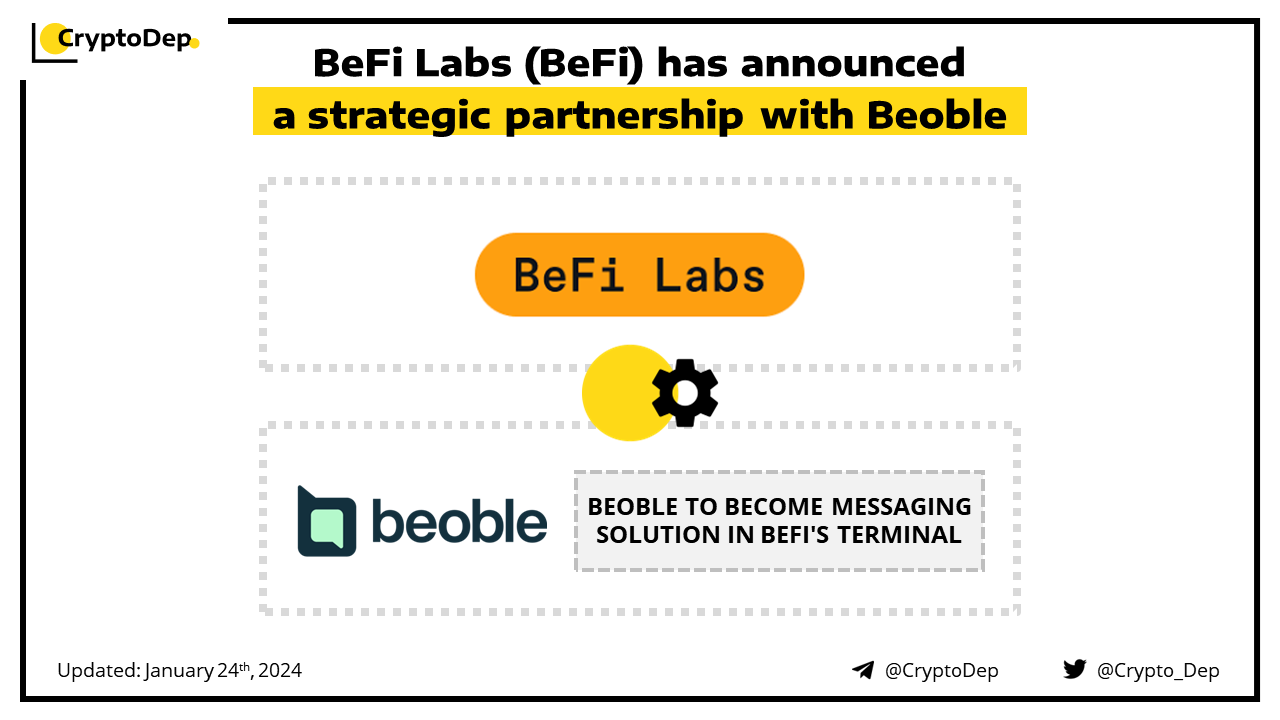 BeFi Labs teams up with Beoble, a communication infrastructure and ecosystem that allows users to chat between wallets. Under this partnership, Beoble will become an official chat messaging solution in BeFi's trading terminal. BeFi Labs is a native BRC-20 & Ordinals trading terminal that has conducted its IDOs on Ape Terminal, BRC App, and AIT Launchpad.