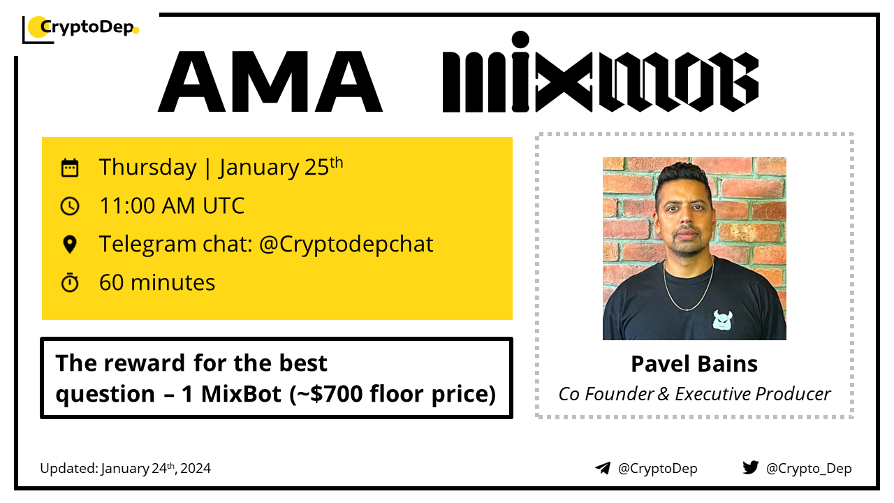 ββπ Dear community, CryptoDep will host an AMA with MixMob $MXM team on Thursday, 25th of January, at 11:00 AM UTC in the CryptoDep Chat