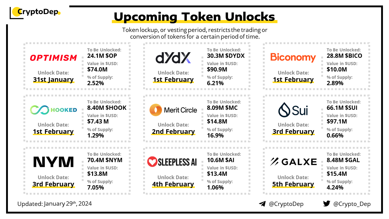 Let's take a look at the compilation of major upcoming token unlocks, diving into details such as dates, amounts, and projects related to tokens that are currently locked up, but will soon be released to the market. During this week, $SUI, $DYDX, $OP, $GAL, and $MC will have the biggest unlocks.