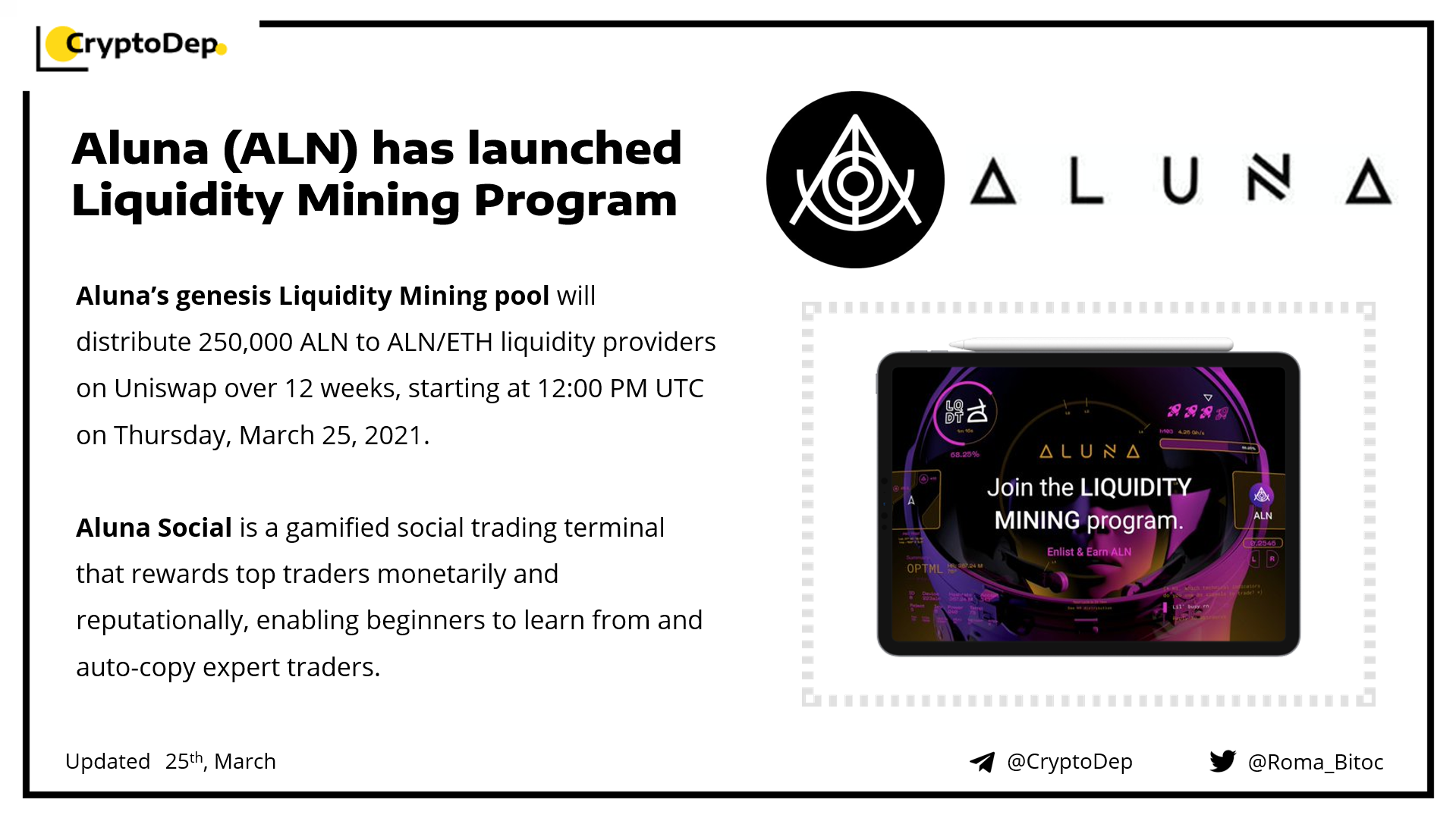 Aluna’s genesis Liquidity Mining pool will distribute 250,000 ALN to ALN/ETH liquidity providers on Uniswap over 12 weeks, starting at 12:00 PM UTC on Thursday, March 25, 2021.
