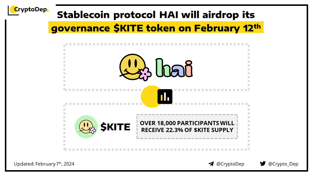 ββStablecoin protocol HAI will airdrop its governance $KITE token on February 12th