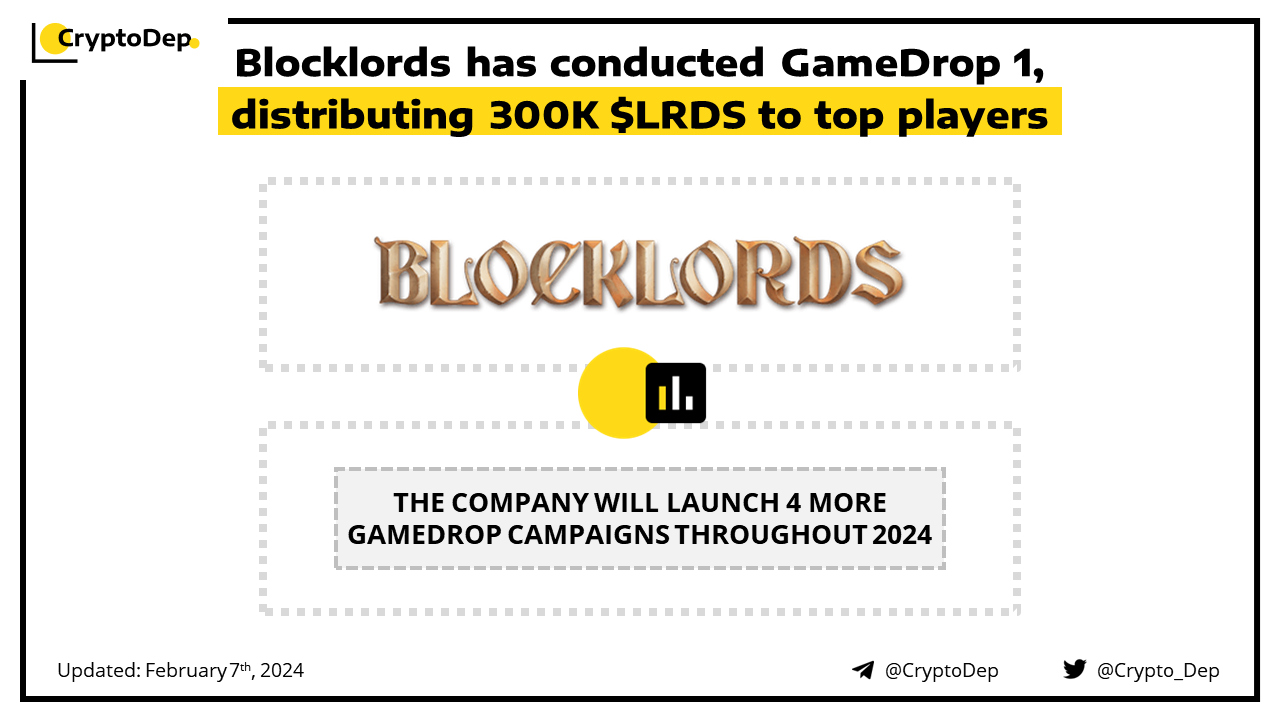 Blocklords has announced the completion of the GameDrop 1 campaign, the snapshot was made on February 1st. The company has also distributed 300K $LRDS tokens to top players. Moreover, Blocklords will conduct 4 more GameDrops throughout 2024.