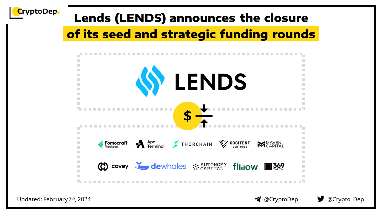 Lends has successfully closed its seed and strategic investment rounds with participation from Cogitent Ventures, Maven Capital, Covey Network, Ape Terminal, Dewhales, Flow Ventures, Fomocraft Ventures, THORChain, and 369 Capital among others. Lends has conducted its $LENDS public sales on Ape Terminal and Bybit Web3, and will be initially listed on the Bybit exchange tomorrow, on February 8th, at 10:00 AM UTC.